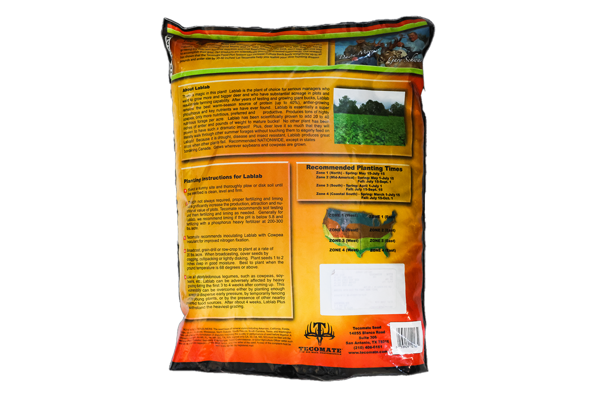 Tecomate® Lablab is the seed that STARTED IT ALL for Tecomate® Wildlife Systems. Highly nutritious, unsurpassed in its complete nutritional make up and a great source of antler-growing phosphorus. Extreme forage production and the highest protein of any in the plant industry make this the manager’s choice for summer food plots for growing big bucks. Vulnerable to heavy grazing the first 6 weeks. Plant additional acreage to compensate or protect with fencing. No other plant is proven to have such a dramatic impact on white-tailed deer!